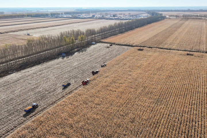 2024年10月16日,在黑龍江省肇東市五里明鎮(zhèn)東升村,農(nóng)民駕駛農(nóng)機進行收割作業(yè)(無人機照片)。新華社記者 謝劍飛 攝